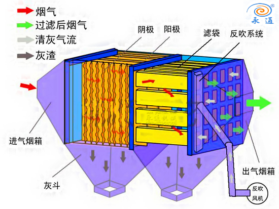 清灰是由程序控制器定时顺序起动脉冲阀,使包内压缩空气(0.5~0.7MPa)由喷吹管孔眼喷出(称一次风)通过文氏管诱导数倍于一次风的周围空气 (称二次风),进入滤袋使滤袋在瞬间急剧膨胀,并伴随着气流的反方向作用抖落粉尘,附于袋表的粉尘迅速脱离滤袋落入灰斗(或灰仓),粉尘由卸灰阀排出,达到清灰的目的。